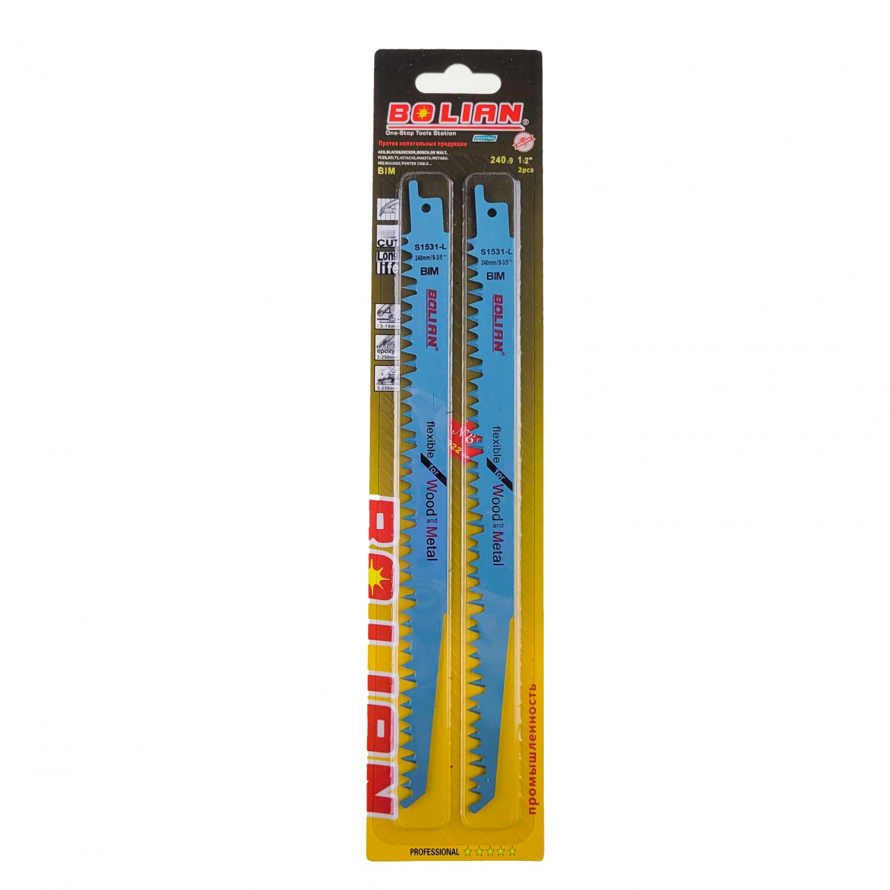 Cабельное пильное полотно S 1531 L for Wood and Metall обеспечивает чистые быстрые пропилы для удаления сучьев с древесных материалов даже с гвоздями. Острые шлифованные зубья подходят для эффективного удаления сучьев, а также предупреждает нанесение вреда растениям. Крупный шаг зубьев и крупные углубления обеспечивают эффективное удаление материала при быстрой резке. Полотно биметаллическое (BIM) для сабельных пил изготовлено из углеродистой инструментальной стали с фрезерованными волнистыми зубами из быстрорежущей стали. В комплекте 2 пилки. Оснастка для электроножовок от «Bolian» устойчива к износу и имеет длительный срок эксплуатации.