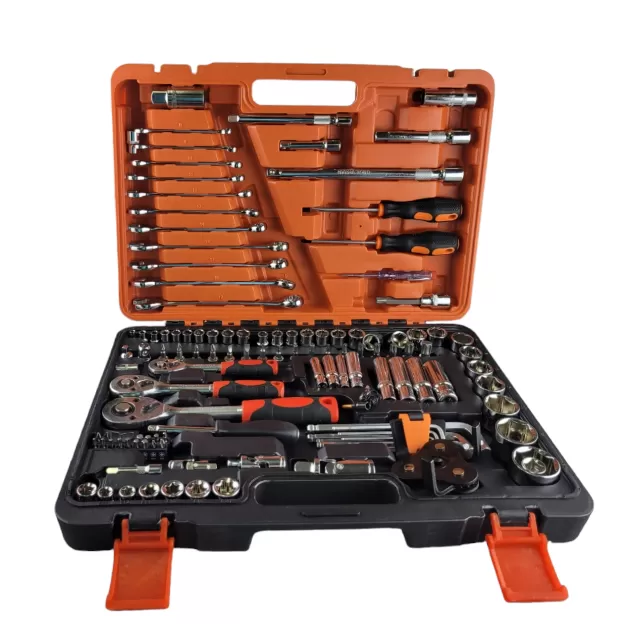 Набор инструментов в чемодане включает в себя 121 предмет и произведён специально для автомобилистов и центров технического обслуживания. Насадки, головки и комбинированные ключи изготовлены из высокопрочной хромованадиевой стали, придающей инструментам исключительную твердость в сочетании с легкостью. Набор упакован в прочный кейс с надежными застежками и изготовлен из жесткого противоударного пластика. Хромованадиевая сталь долговечна, не боится внешних воздействий и коррозии. Все инструменты имеют маркировку с размерами.